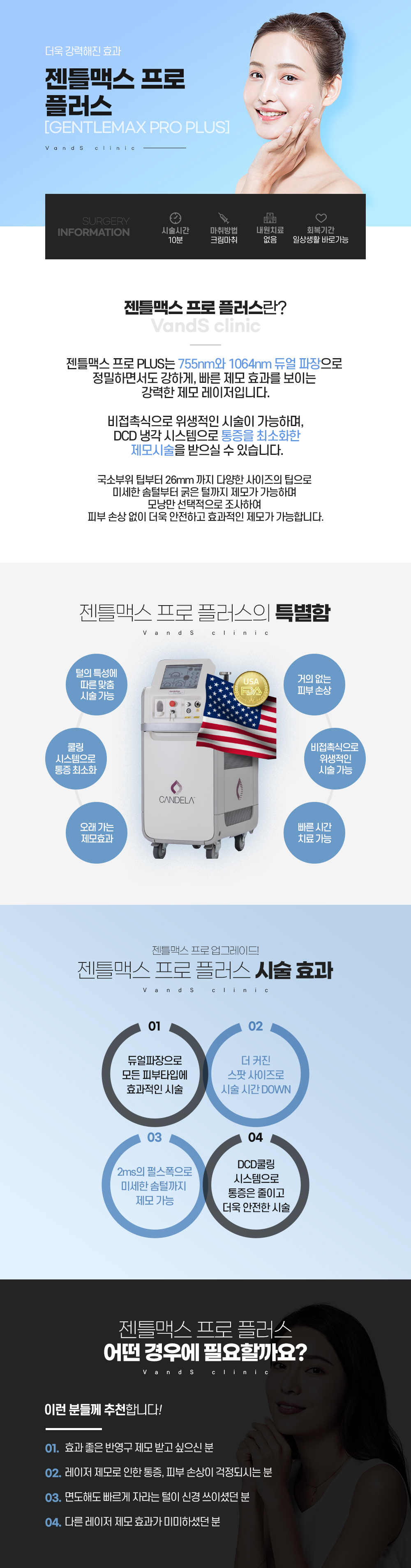 깔끔하게 털 제거를 원하는 모든 부위(얼굴/바디)에 시술 가능하며 짧은 시술시간과 적은 통증으로 간편하게 제모할 수 있습니다.