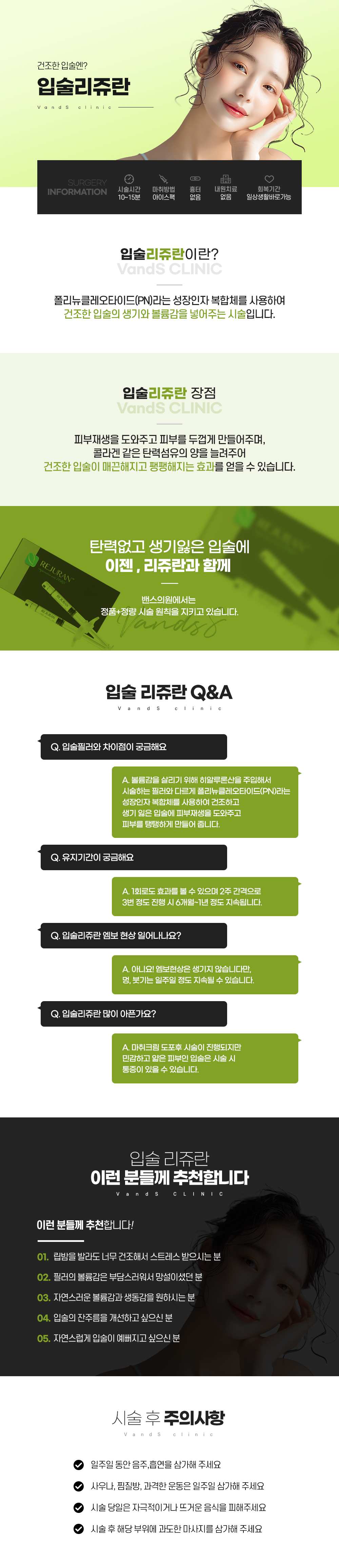 볼륨감을 살리는 필러 시술과 달리 PN 성장인자 복합체를 사용해 생기 잃은 입술의 피부재생을 도와주고 피부를 탱탱하게 만들어줍니다.